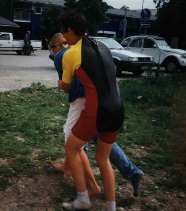 Så blev det Simon L's tur, og her er han ved at blive druknet. Han slap dog med en mindre hjerneskade, så han i dag sidder i en rullestol og savler :-).