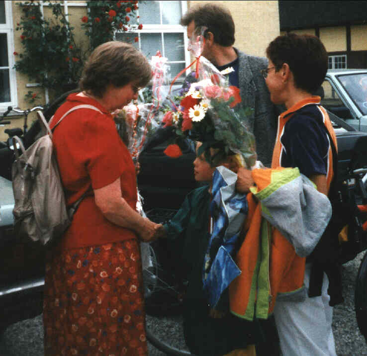 Efter de alle fleste havde været en tur i springvandet havde vi fri til senere, hvor vi skulle til den officielle afslutning. Dette billede er taget lige efter hvor min mor giver min gamle engelsklære mm. en buket blomster. Så kørte vi ud til Luise og hele klassen spiste sammen. Så blev dørene lukket op og der blev holdt en ganske almindelig fest med en masse øl osv. Jeg er dog mere til cola, så jeg smuttede.