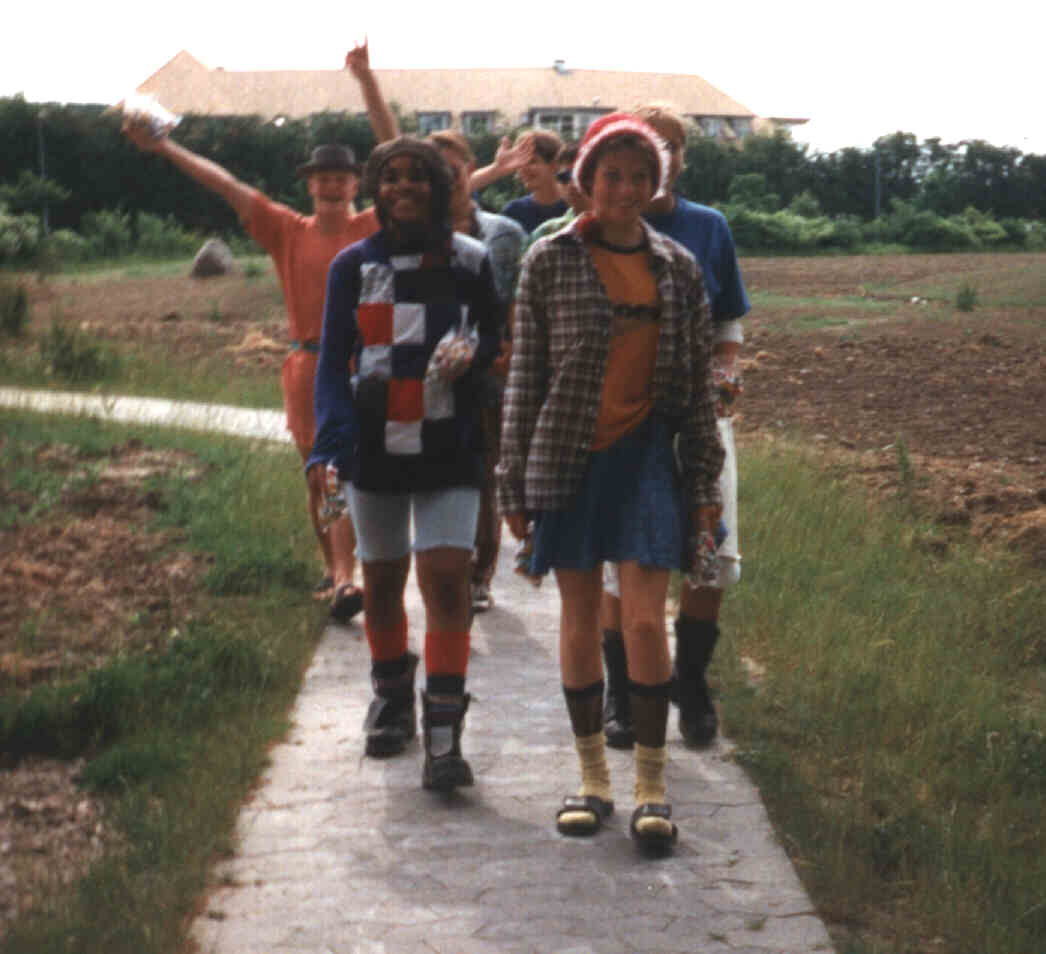 Her er vi på vej til vores jordhøj for at kaste karameller ud til resten af skolen.